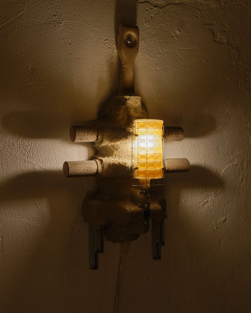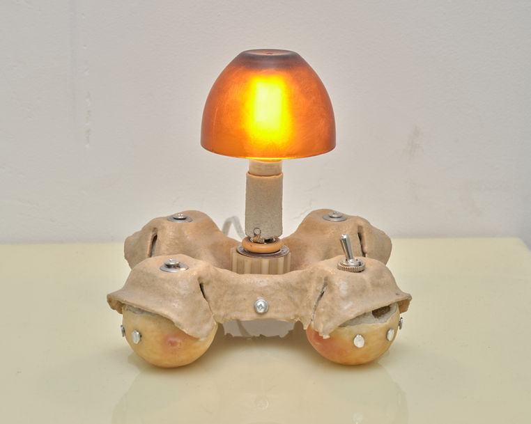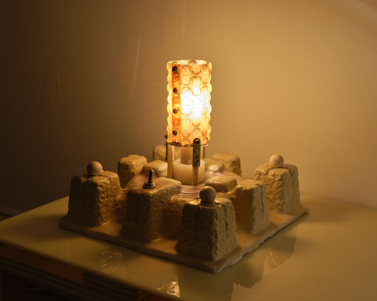Kaleidoscope is pleased to present Floor Model, a two-person exhibition by artists Rex Morris and Daniel Stroh, whose practices explore the byproducts of industrial systems and the aesthetic potential of functional obsolescence. Daniel Stroh collects utilitarian objects - engineered forms born from necessity- and reconfigures them into lamps. Stroh’s practice revitalizes the overlooked architectures that surround and support the objects we use. His work reimagines the forms designed not to be seen but to protect, stabilize, or deliver; foam inserts, die-cut cardboards, molded shells, and rigid casings that are cast off the moment the object they cradle is revealed. The result is a quiet but insistent challenge to the object’s intended lifecycle: a lateral shift in function. Rex Morris, in contrast, builds machines that suggest purpose without ever fulfilling it. They employ the design language of tools that suggest precision and efficiency—only to subvert that logic entirely, prioritizing noise and entropy over control and order. Their sound sculptures resemble tools of industrial process, complete with motors, arms, and pulleys, yet their motions are banal. They move simply to move, producing sound for its own sake, inverting the fundamental logic of utility. Together, Stroh and Morris present a show that addresses the aesthetics of the overlooked and the misused; objects and machines that have slipped through the cracks of their intended roles. Floor Model invites us to look at what’s left behind when function fades, and to consider what flourishes on the margins of utility. Floor Model, presenting new and recent works by Daniel Stroh & Rex Morris, will be on view through November 9. For more information, visuals, or a priced checklist, please contact general@kaleidoscopestudios.net